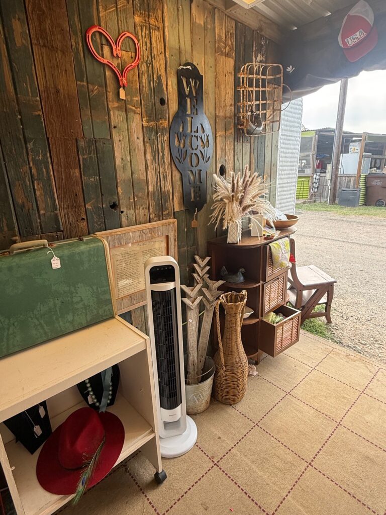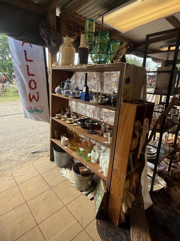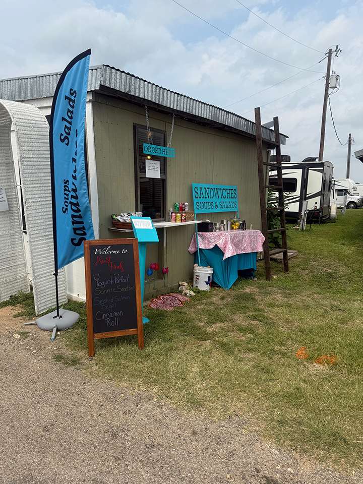 So I decided to try out the Fredericksburg Trade Days, which is a 3 day weekend event, once a month. I started in March in a cute little enclosed cabin like spot, I thought it was perfect, with air conditioning inside! But we ultimately decided it wasn’t quite right to sell in that spot, so we ended up changing gears and selling food (sandwiches, soups & salads) out of the spot instead. Then, in April, our debut of serving food, our next door neighbor, who had the perfect outdoor spot, was selling their building. I decided I couldn’t pass up on the opportunity, so it is now the May show, and here we are, all set up with everything!.